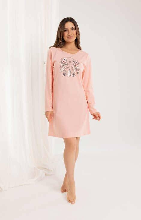 162 Bavlněná noční košile Regina apricot - dlouhý rukáv, potisk, pod kolena