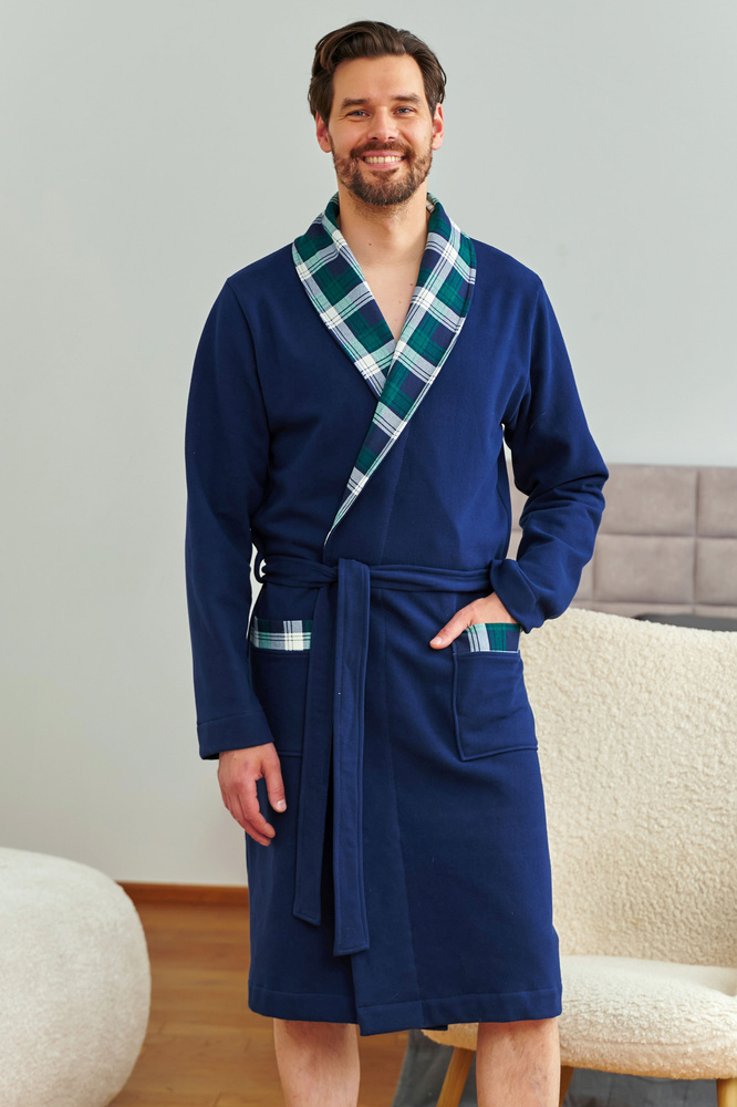 Model 7366 je určen pro muže, kteří ocení pohodlí i dobrý styl. Župan je vyroben z vysoce kvalitní bavlny a zahaluje tělo do měkkého přírodního materiálu. Klasický střih v tmavě modré barvě doplňují detaily z kostkované látky na límci a kapsách. Zavazování v pase zajišťuje pohodlné nošení a praktické kapsy zdůrazňují funkčnost modelu. Ideální pro chladná rána i večery s knihou nebo seriálem. Tohle je domácí luxus v té nejlepší podobě.