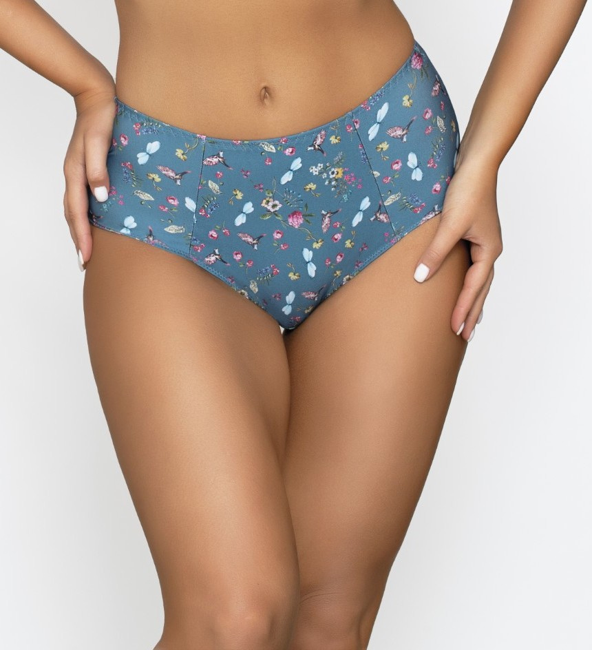 Model zaujme výrazným svátečním potiskem v modrých a tyrkysových odstínech s motivy květin, ptáků a motýlů.
