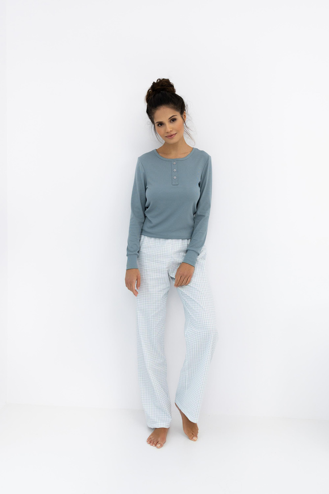 Dotaz na výrobekDámské pyžamo Janelle je dokonalou kombinací stylu a pohodlí. Tričko s dlouhými rukávy z měkkého žebrovaného úpletu se směsí modalu, bavlny a elastanu. Kulatý výstřih s ozdobnými knoflíky dodává jemný nádech půvabu. Součástí sady jsou dlouhé rovné kalhoty s módním kostkovaným vzorem, ušité ze vzdušné směsi bavlny a viskózy. Elastický pas pro pohodlné nošení po celou noc. Ideální pro chladnější večery, skvělý také jako dárek.