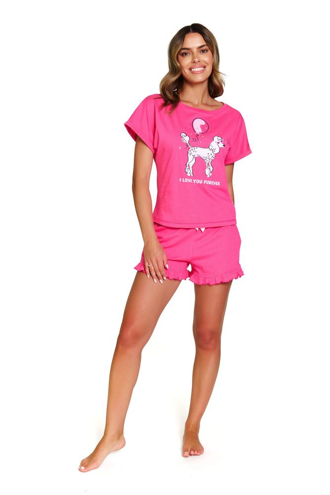 Doctor Nap 7357 je dámské pyžamo, které spojuje pohodlí s dívčím šarmem. Je vyrobena z vysoce kvalitní, měkké bavlny a je ideální pro letní noci a rána. Tričko s krátkým rukávem zdobí roztomilý potisk pudla a nápis "I love you furever". Krátké šortky s volánkem a saténovou mašlí dodávají lehkost a půvab. Toto je ideální pyžamo pro ženy, které si rády hrají s módou - i doma.