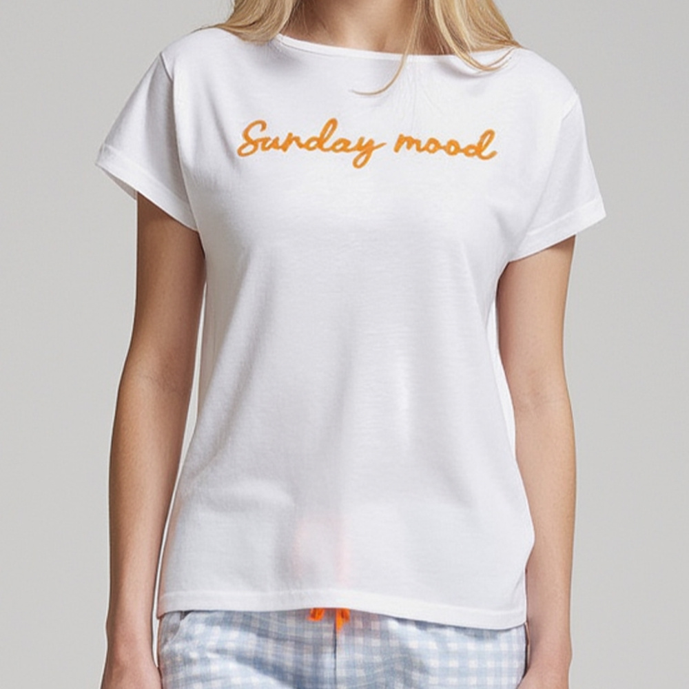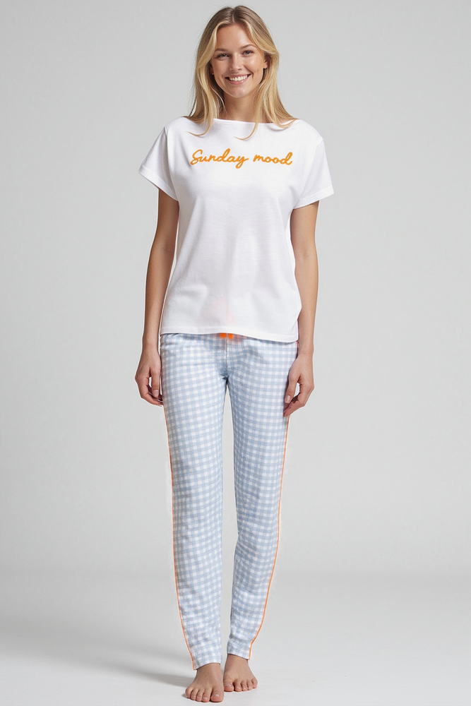 - Dámské bavlněné pyžamo Dana Sorbetto. Tričko s výšivkou a krátkými rukávy, modrobílé kostkované kalhoty s lemováním a šňůrkou na stažení. Přírodní tkanina, pohodlný střih.