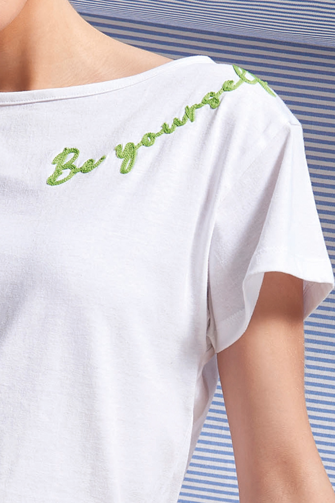 Tričko s krátkým rukávem má klasický kulatý výstřih a ozdobnou výšivku, která mu dodává jemný šarm. Kárované šortky mají kontrastní lemování, elastický pas a šňůrku na stažení, díky níž se lem přizpůsobí vaší postavě.