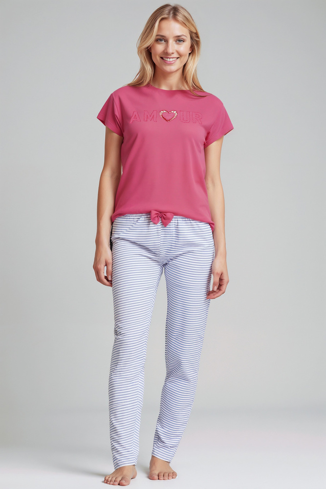 Juliana Sorbetto růžová - dámské pyžamo 100% bavlna, s výšivkou a dlouhými pruhovanými kalhotami