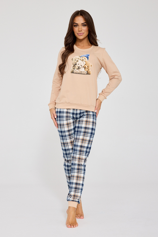 Vrchní část pyžama tvoří tričko s dlouhými rukávy, které zdobí velký potisk medvídka - tento motiv navozuje zimní atmosféru a zároveň působí velmi esteticky a žensky. Klasické kostkované kalhoty ho krásně doplňují a dodávají mu sváteční nádech, takže pyžamo je ideální na prosinec a celou zimu.