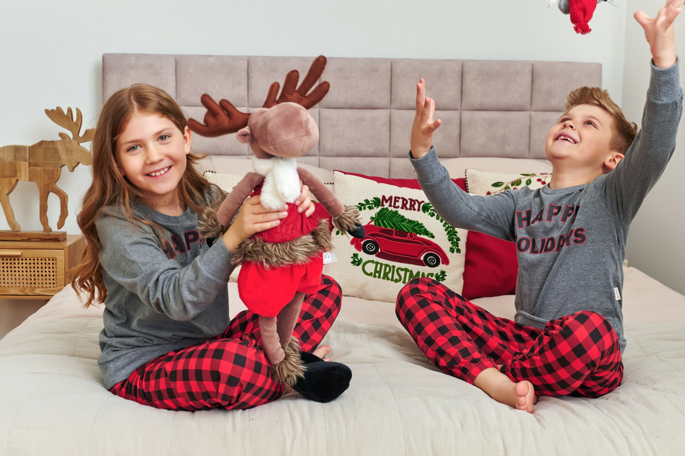 Šedý top s potiskem "Happy Holidays" navodí sváteční náladu, zatímco červenočerné kostkované kalhoty dodají styl a zábavu. Volný střih neomezuje v pohybu, takže pyžamo je vhodné i na hraní doma.