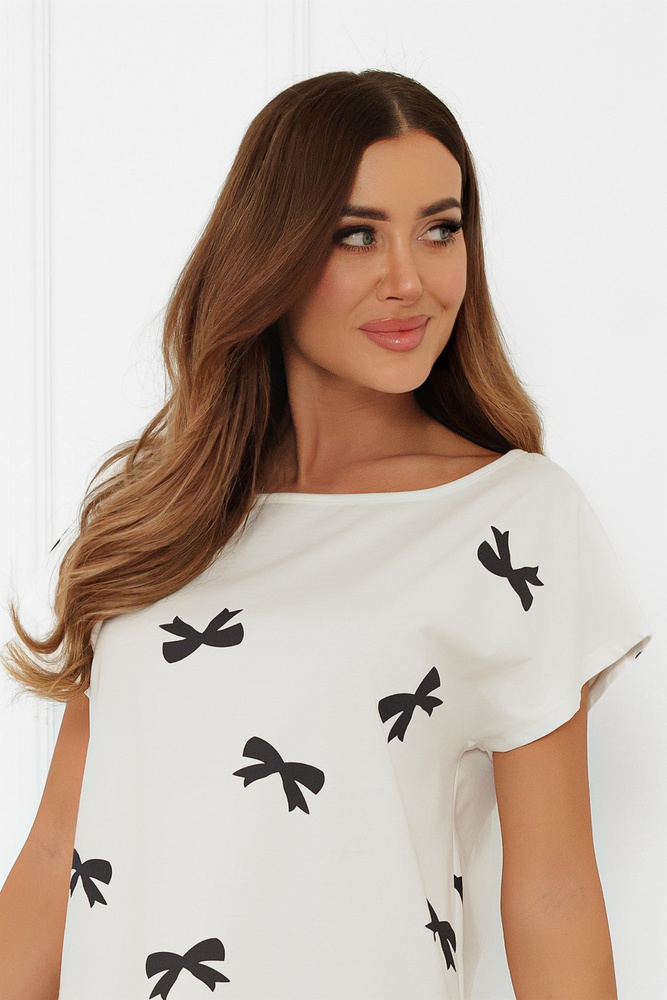 Model v barvě ecru zdobí jemný vzor černých mašlí, který dodává celkovému designu stylový nádech. Volný střih zajišťuje volnost pohybu a díky krátkým rukávům je košile ideální po celý rok.