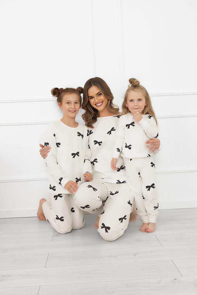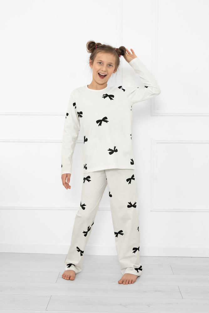 • Dívčí pyžamo Fiocca v barvě ecru, vyrobené ze 100% měkké bavlny. Zdobený roztomilým vzorem černých mašlí, s dlouhými rukávy a žebrovanými kalhotami. Pohodlné, ideální pro chladnější noci.
