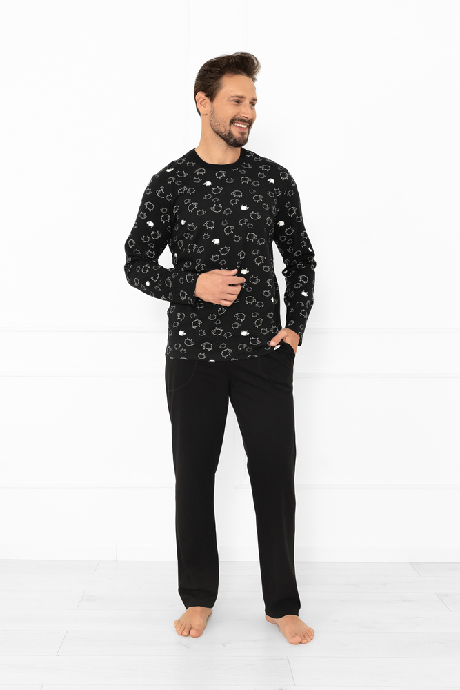 Vrchní díl soupravy tvoří tričko s dlouhými rukávy a klasickým kulatým výstřihem, které zdobí vzor bílých oveček na černém pozadí - motiv, který pyžamu dodává humor a jedinečný styl. Kalhoty v hladké černé barvě mají volný střih, pružný pas bez námahy a dvě praktické boční kapsy.
