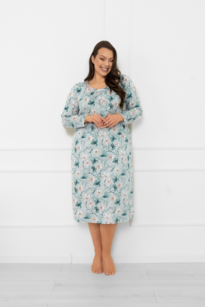 Model má volný střih a dlouhé rukávy, takže je ideální volbou pro chladnější noci. Kulatý výstřih zdobí jemné řasení a saténové lemování s mašlí, které košili dodává romantický a ženský nádech. Celkový design je laděn do pastelových tónů s jemným květinovým potiskem, který podtrhuje lehkost a eleganci.