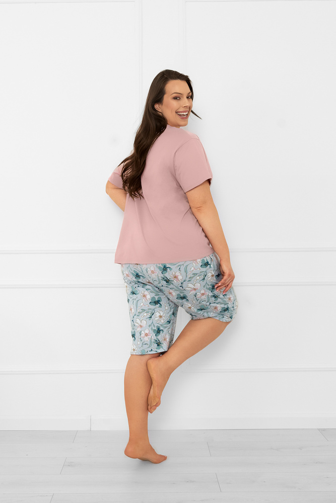 • Dámské letní pyžamo z bavlny. Hladké tričko s krátkým rukávem a kalhoty s květinovým potiskem. Lehké, vzdušné, ideální pro teplé noci.