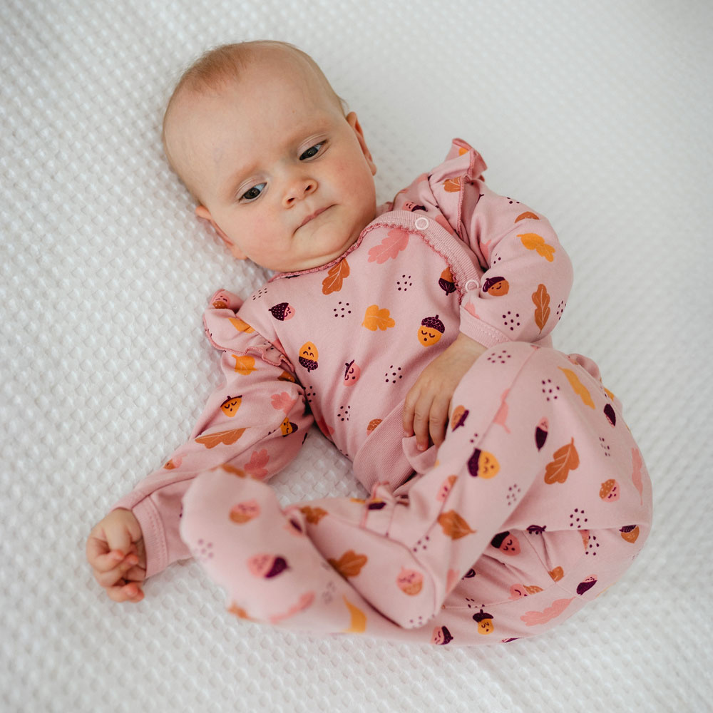 Růžový model má dlouhé rukávy, jemné volánky na ramenou a módní podzimní potisk. Tělo je připevněno obálka na bocích a v rozkroku praktické patentky, které usnadňují přebalování novorozence a zajišťují pohodlí při přebalování.