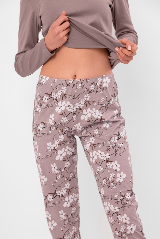 Barevně sladěné kalhoty mají dlouhé nohavice a ženskost jim dodává bílý kontrastní květinový potisk. Pohodlí při nošení zajišťuje elastický pas a kapsy, které zvyšují funkčnost soupravy.