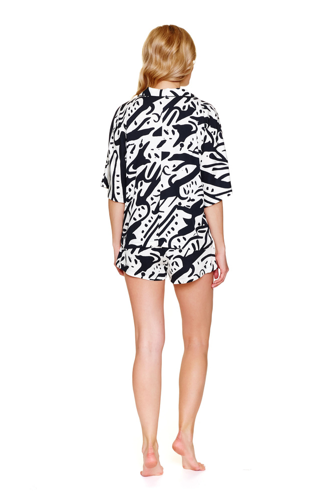 Dámské pyžamo Doctor Nap 7310 z kolekce La Palma je dokonalou kombinací pohodlí a moderního designu. Souprava se skládá ze vzdušného trička s knoflíky a krátkých šortek. Geometrický černobílý vzor dodává celkovému designu jedinečný nádech.