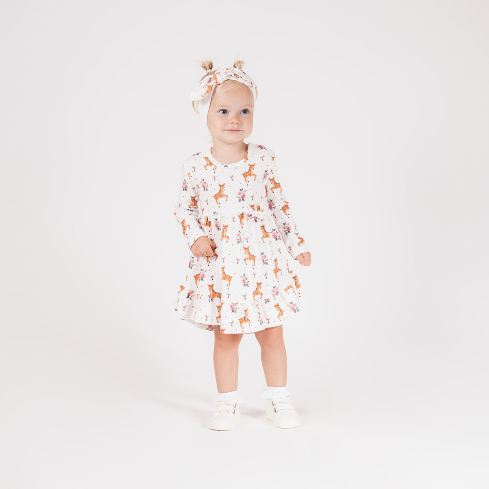 Model má dlouhý rukáv a rozšířený střih zakončený volánkem, který mu dodává dívčí půvab. V pase je ozdobná mašle a celek je doplněn roztomilým potiskem jelenů a květin.