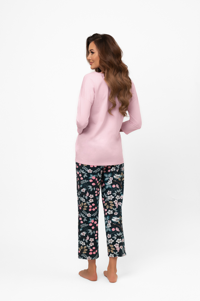 Dámské pyžamo Marisal je pohodlná souprava na spaní a domácí relaxaci. Blůza světlé barvy s výstřihem do V a 3/4 rukávy má rovný střih pro volnost pohybu a pohodlí během noci. Hladká textura tkaniny dokonale doplňuje kontrastní kalhoty. Kalhoty v tmavém odstínu, zdobené květinovým potiskem, mají délku 7/8, rovné nohavice a elastický pas, který netlačí a přizpůsobí se postavě. Pyžamo je vyrobeno z přírodní bavlny a zaručuje prodyšnost, měkkost a trvanlivost. Je to ideální volba pro ženy, které hledají pohodlné a zároveň estetické pyžamo.