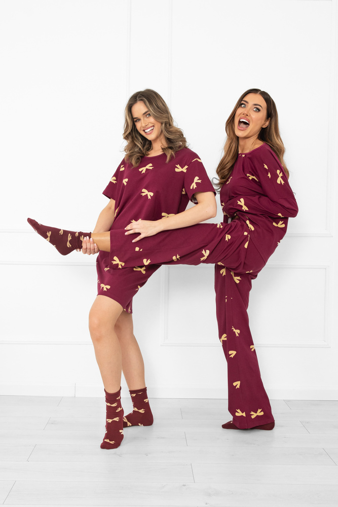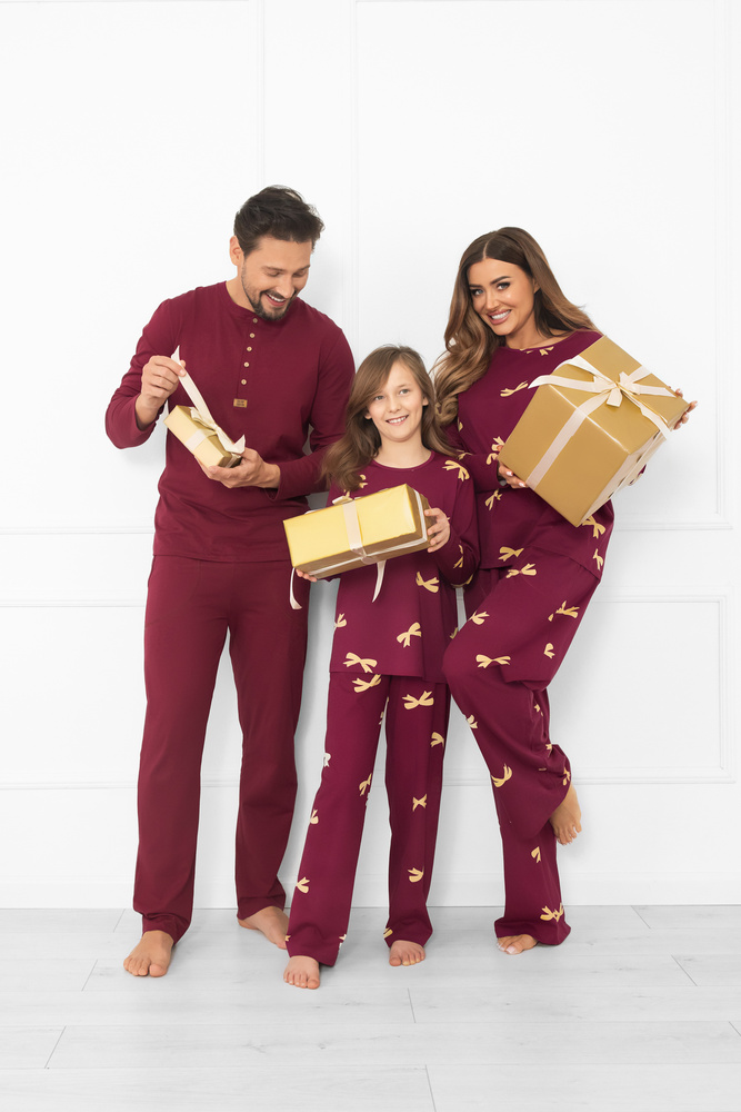 Dámské pyžamo Kwadro značky Italian Fashion je kombinací pohodlí, kvality a ženského stylu. Je vyrobena z přírodní bavlny bez pesticidů a umělých barviv, je měkká, příjemná na dotek a bezpečná pro pokožku. Volná halenka s dlouhými rukávy a kulatým výstřihem poskytuje volnost pohybu, zatímco kalhoty se širokými nohavicemi a elastickým pasem zaručují plné pohodlí. Další výhodou jsou praktické boční kapsy. Celek zdobí jemné mašličky, které pyžamu dodávají šarm a ženskou eleganci. Ideální volba pro maminky a dcery - k dispozici jsou také dětská pyžama ve stejném stylu.