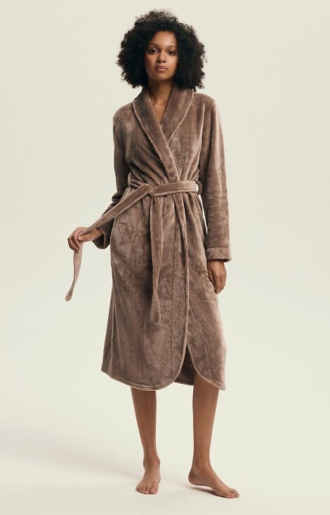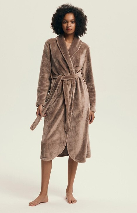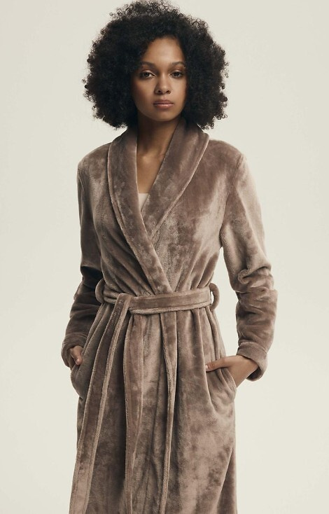 • Elegantní dámský župan se šálovým límcem a zavazováním v pase. Vyrobeno z měkké pleteniny, ideální pro chladnější dny.