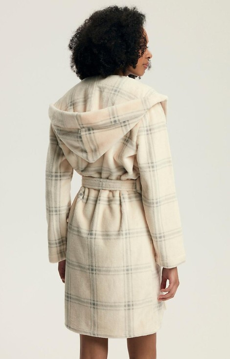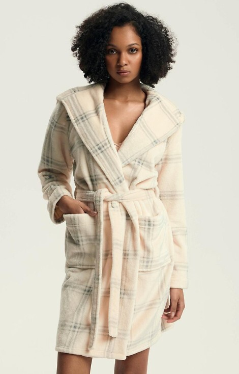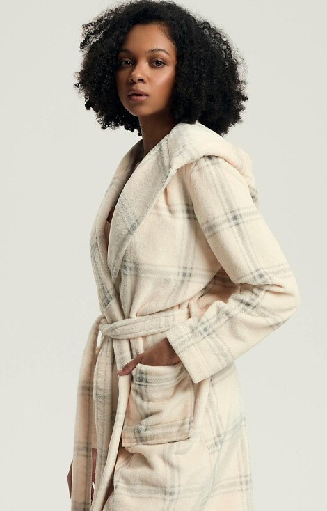 • Dámský župan z měkké pleteniny, s kapucí a kapsami. Károvaný vzor mu dodává kouzlo.