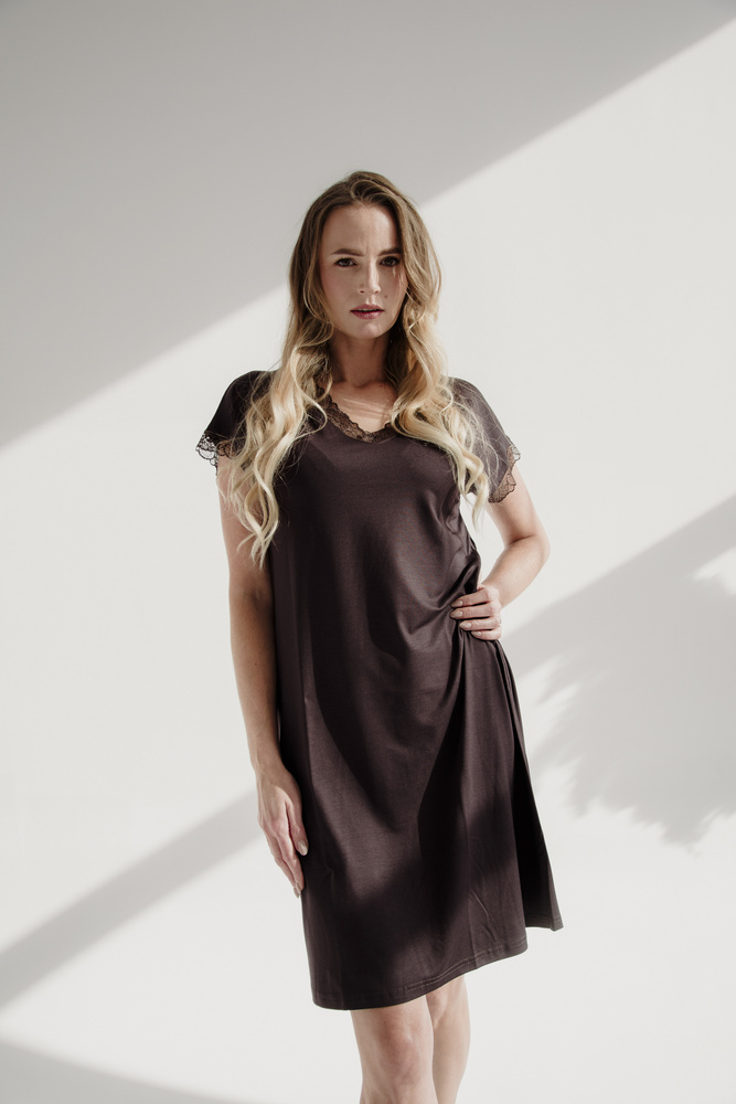 Elegantní dámské tričko s krátkým rukávem. Model z vysoce kvalitní viskózy. Výstřih a ramínka zdobené krajkou s květinovými motivy. Osloví ženy, které milují jemnost a volnost.