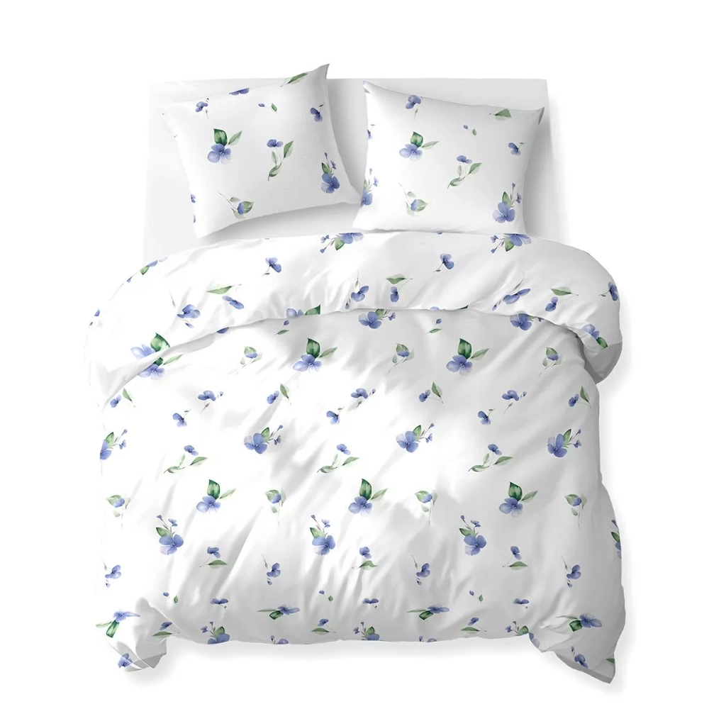 5769 B Cotton Bloom Detexpol bílé povlečení s modrými květy se zelenými listy - 100% bavlna, oboustranné, polská výroba