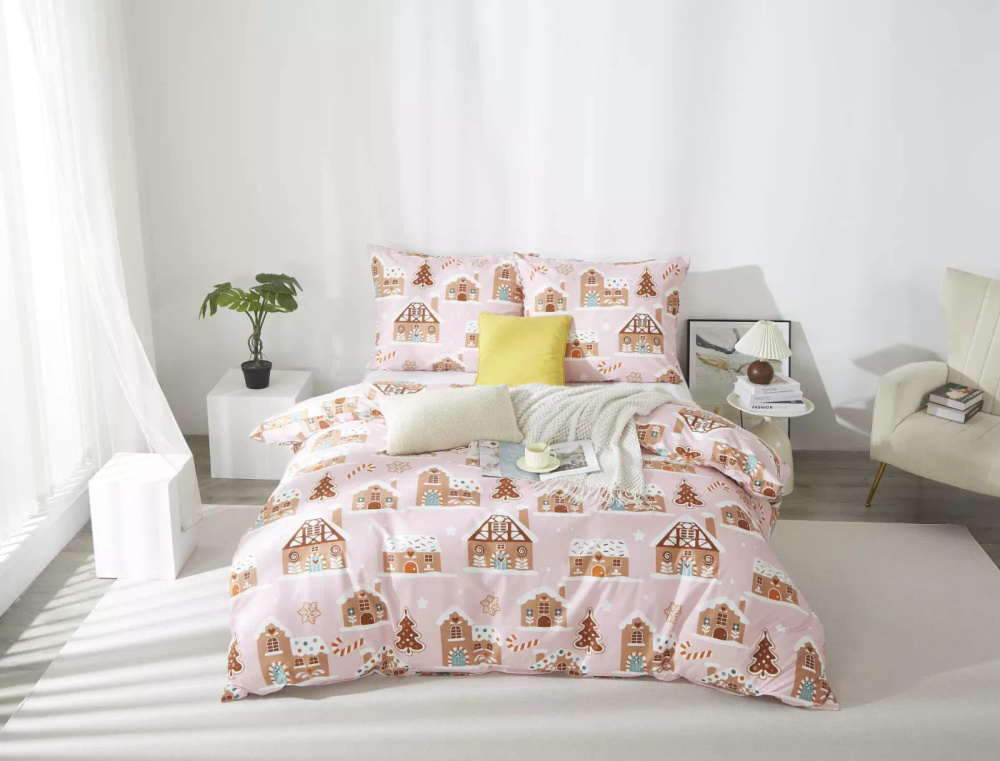 Vánoční mikrosaténové povlečení Gingerhouse Perníkové chaloupky růžové I25 Spod Igły i Nitki - měkké, hladké a odolné
