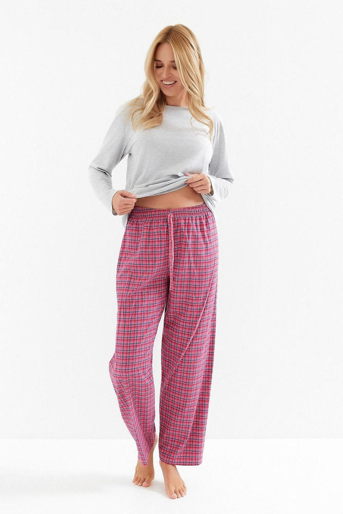 - Pyžamo Taro Madlen 3512. Bavlněné tričko s potiskem a dlouhými rukávy, kostkované kalhoty s gumou a zavazováním na nohavicích.