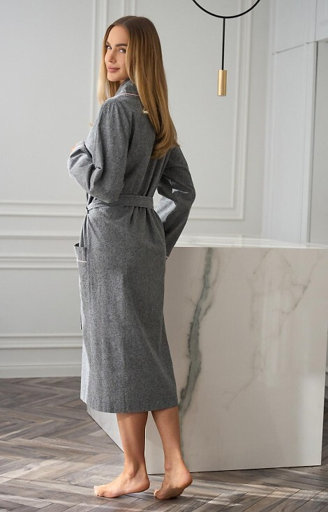 Župan má klasický dlouhý střih se šálovým límcem, který mu dodává šik a eleganci.