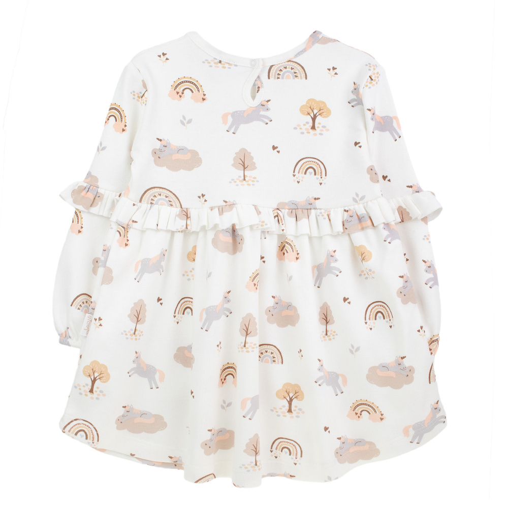 • Krémové šaty Nicol s dlouhými rukávy ze 100% bavlny s potiskem jednorožce. Zdobené volánky, s elastickými rukávy a praktickým zapínáním na slzu.