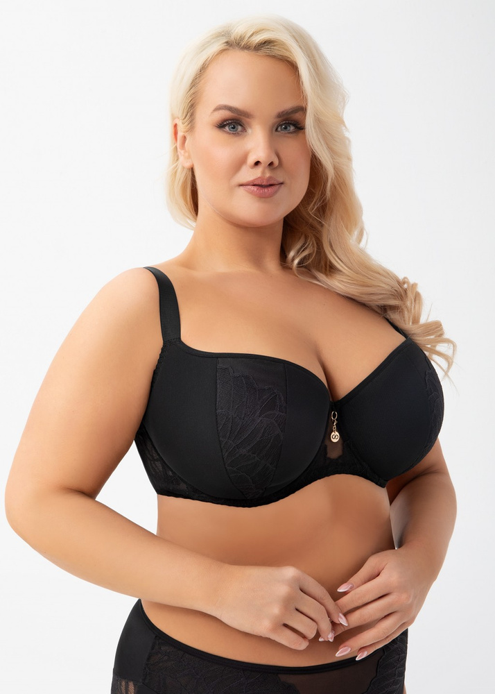 Třídílné košíčky jsou vyrobeny z pěny pokryté elastickým tylem a krajkou, což zaručuje ideální formování prsou a estetický, ženský vzhled. Boční velrybí kostice zabraňují kroucení látky a zadní část z lycry zajišťuje dokonalé přizpůsobení a stabilizuje lem. V závislosti na velikosti je k dispozici dvouřadý, třířadý nebo čtyřřadý systém zapínání na háčky a očka s třístupňovým nastavením, který umožňuje přesné přizpůsobení podprsenky.