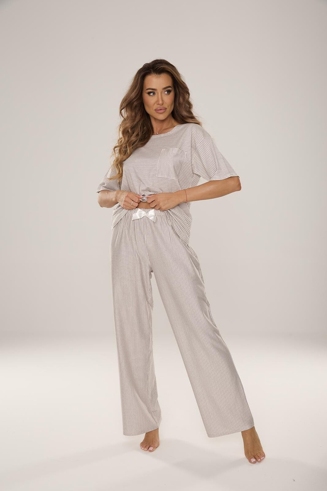 • Pruhované bavlněné dámské pyžamo s volným tričkem s krátkým rukávem a dlouhými kalhotami. Přírodní materiál, pohodlný střih a ženské detaily - ideální pro spánek a domácí relaxaci.