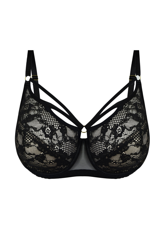 Smyslný design s černou krajkou, ozdobnými ramínky vytvářejícími efekt pavučiny a pohodlnou konstrukcí.