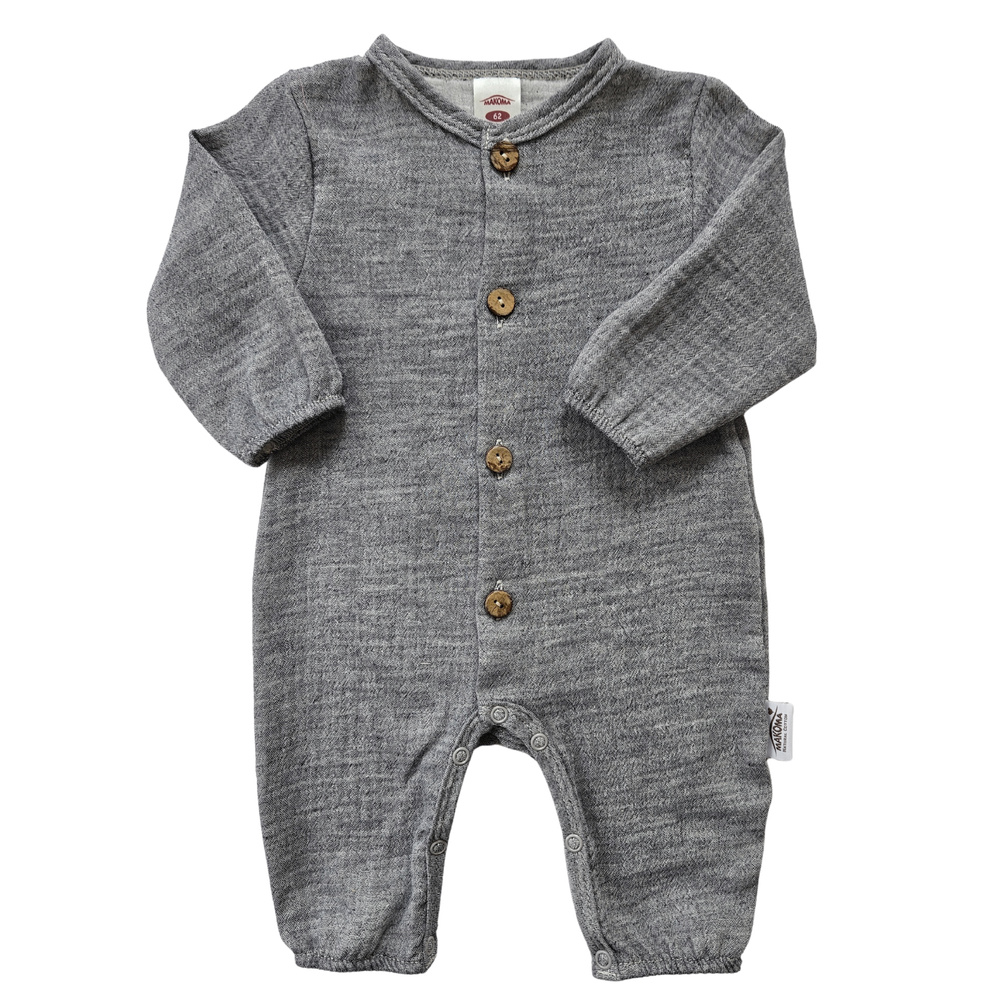 Volný, ale promyšlený střih neomezuje v pohybu a zapínání na patentky usnadňuje rychlé přebalování a výměnu plenky. Dlouhé rukávy a nohavice chrání pokožku a zároveň nepřehřívají dítě. Je vynikající volbou pro novorozence i starší děti.