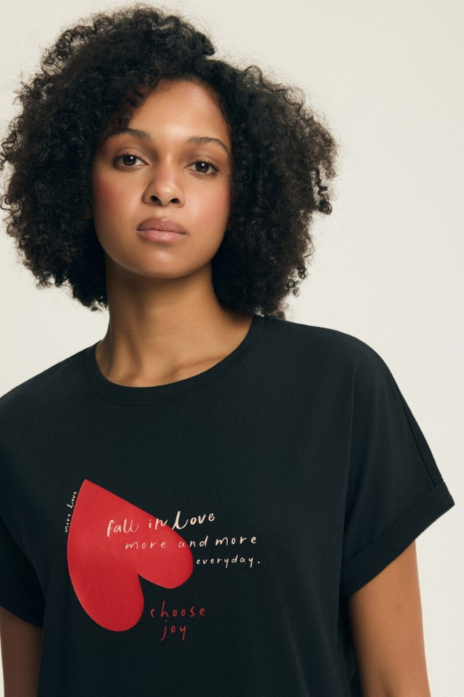 Krátké rukávy a půlkruhový výstřih mu dodávají jemnou eleganci, ideální pro každé roční období. Na přední straně košile je navíc jemný nápis, který jí dodává jedinečný charakter. Díky uvolněnému střihu je noční košile mimořádně pohodlná a neomezující, takže je ideální jak na spaní, tak na každodenní domácí relaxaci. Délka ke kolenům zajišťuje pohodlí, aniž byste se museli obávat příliš podpůrných materiálů.