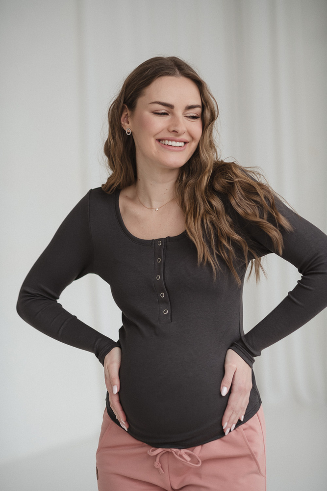 Přiléhavý střih zvýrazňuje siluetu, zatímco stříbrné patentky u výstřihu umožňují pohodlné kojení doma i mimo domov. Zároveň tvoří decentní ozdobný detail. Halenku lze kombinovat s těhotenskými džíny, legínami nebo elegantními kalhotami – hodí se do práce, na procházku i na společenskou příležitost.