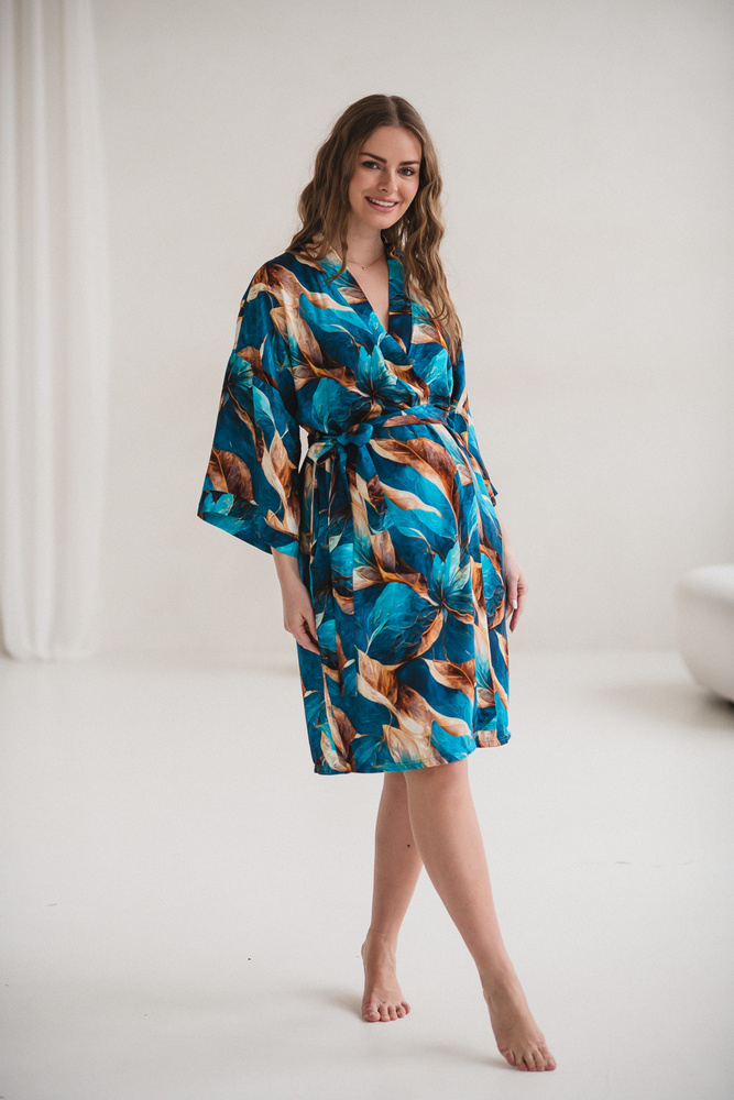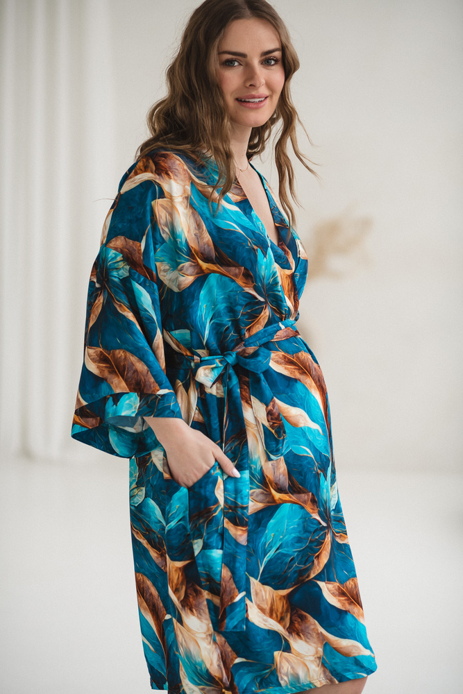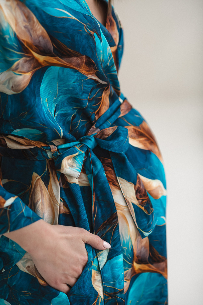 Střih kimono s páskem umožňuje snadné nastavení šířky a pohodlné přizpůsobení rostoucímu bříšku. Delší délka zajišťuje pocit jistoty při pobytu v porodnici i doma během rekonvalescence. Rukávy v délce 7/8 nepřekážejí při péči o novorozence a praktické kapsy poslouží na drobnosti.
