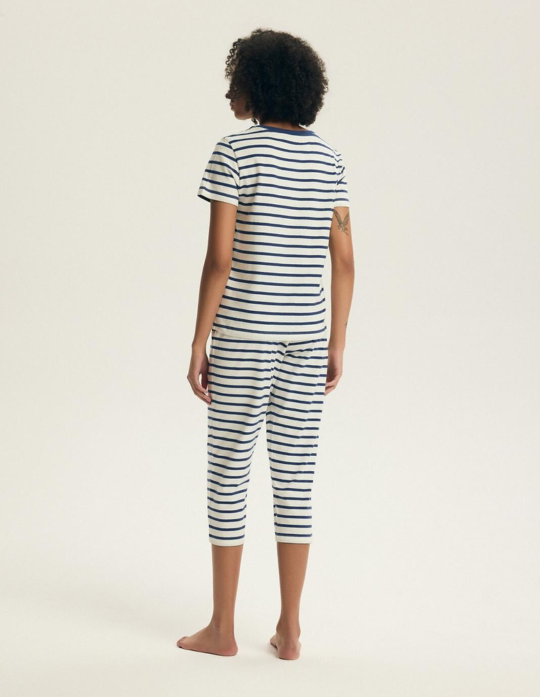 Horní díl má krátký rukáv a polokulatý výstřih. Volnější střih neobepíná tělo a poskytuje dostatek prostoru pro pohodlný pohyb. Pruhovaný vzor působí klasicky a svěže, zatímco jemný nápis „be happy“ na hrudi dodává pozitivní detail.