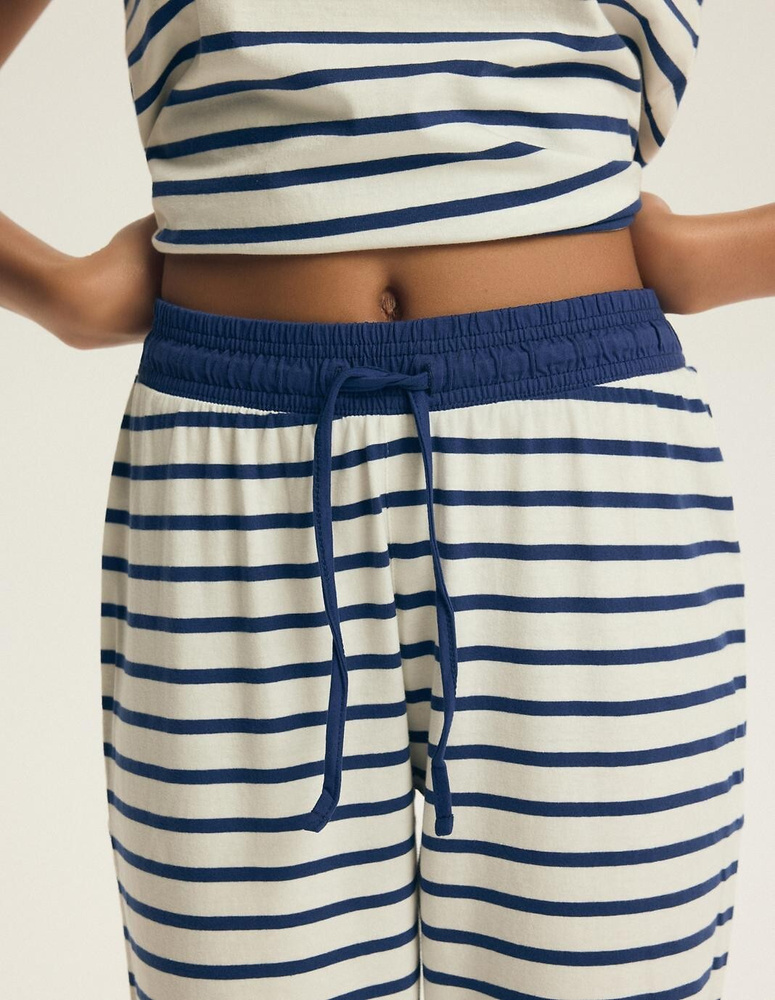 Kalhoty v délce 7/8 jsou praktické a univerzální – vhodné jak na teplejší období, tak i na přechodné sezóny. Jednobarevný pas se šňůrkou umožňuje regulaci obvodu a přizpůsobení podle postavy. To zajišťuje stabilitu a komfort během spánku i relaxace doma.
