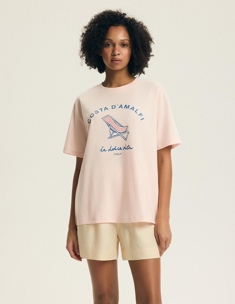 Tričko s krátkým rukávem je vyrobeno ze 100% bavlny. Materiál umožňuje pokožce dýchat a poskytuje příjemný pocit i během teplejších nocí. Kulatý výstřih vytváří klasický vzhled a barevný potisk s plážovým motivem dodává modelu svěží letní charakter.