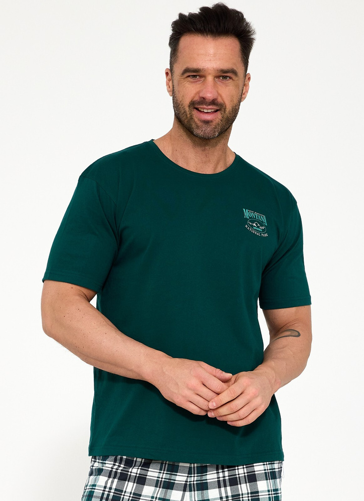 Pyžamo je vyrobeno ze 100% bavlny, která je měkká, prodyšná a příjemná na dotek. Materiál umožňuje pokožce dýchat a pomáhá udržovat komfortní teplotu během noci. Tričko s krátkým rukávem má kulatý výstřih, který netlačí a dobře sedí. Jednobarevný vršek doplňuje decentní potisk na hrudi, jenž dodává moderní vzhled bez přehnané výraznosti. Vzorované kalhoty vytvářejí vyvážený komplet vhodný jak na spaní, tak jako pohodlné domácí oblečení.