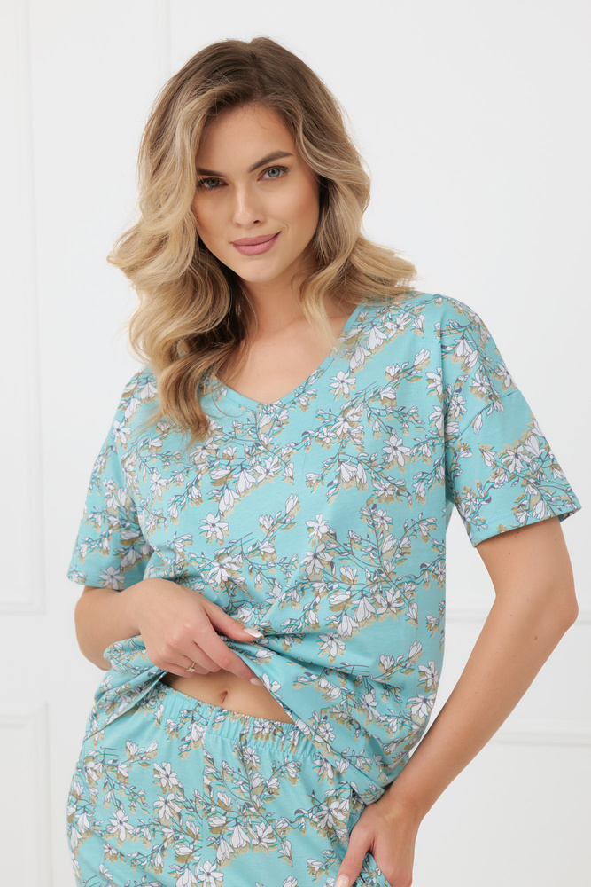 Horní díl má klasickou linii s výstřihem do V, který opticky prodlužuje krk a působí lehce. Krátké rukávy jsou ideální do teplejších dnů nebo vytápěných interiérů. Kalhoty v délce 3/4 jsou vybaveny praktickými kapsami, což zvyšuje funkčnost a umožňuje pohodlné nošení i mimo ložnici.