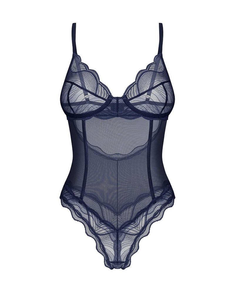 - Smyslné body Nightly Blue od značky Obsessive kombinuje transparentní materiál s jemnou krajkou a elegantní tmavě modrou barvou. Měkké košíčky s kosticí přirozeně tvarují poprsí, nastavitelné ramínka zajišťují pohodlné přizpůsobení. Ideální volba pro ženy