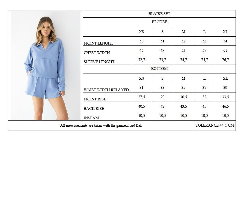 Komplet se skládá z volnější mikiny a pohodlných šortek s vysokým pasem. Mikina má moderní design s charakteristickým polo límečkem a výstřihem do V, který opticky prodlužuje krk a dodává siluetě lehkost. Ozdobné prošití v oblasti poprsí vytváří zajímavý geometrický detail a dodává modelu osobitý charakter.