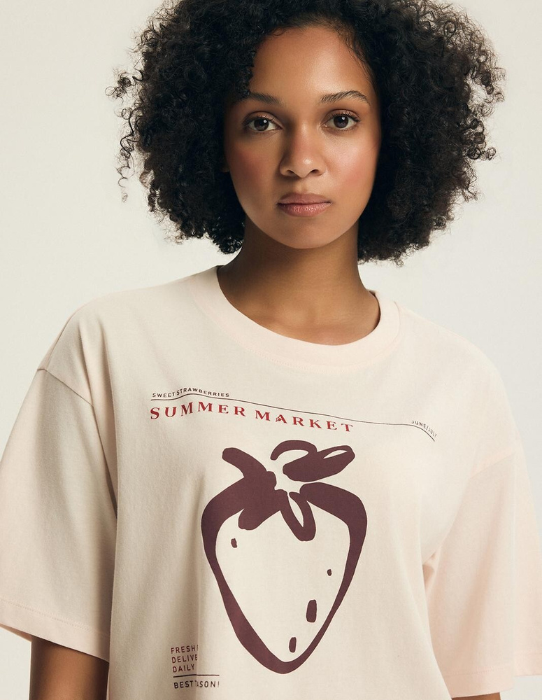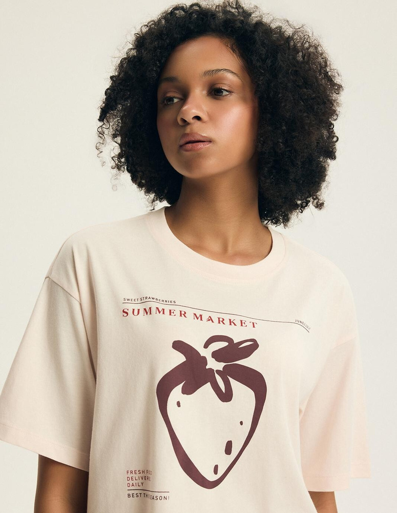 Tričko má kratší střih, krátké rukávy a klasický kulatý výstřih, který zajišťuje pohodlí při nošení. Přední část zdobí jemný potisk jahod, který dodává pyžamu svěží a ženský vzhled.