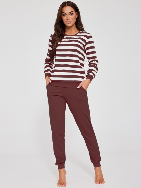 Horní díl tvoří pruhované tričko s dlouhým rukávem, které nabízí volnost pohybu a příjemné přizpůsobení postavě. Spodní lem trička i manžety rukávů jsou zakončeny měkkým pružným nápletem, díky kterému pyžamo dobře drží tvar a nevyhrnuje se během spánku. Dlouhé jednobarevné kalhoty v čokoládovém odstínu doplňují celý komplet a vytvářejí harmonický vzhled. V pase mají elastickou gumu a nastavitelné šňůrky, takže si můžete snadno upravit obvod podle potřeby.