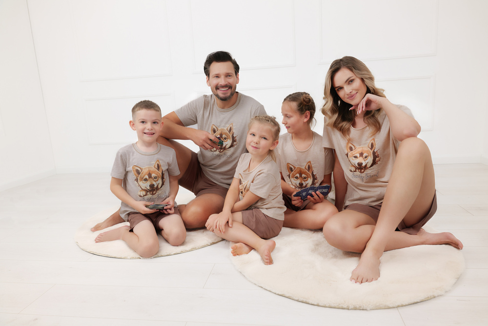 Horní díl má klasický, volný střih s krátkým rukávem a kulatým výstřihem. Neobepíná postavu, čímž poskytuje maximální volnost pohybu a pohodlí při spánku i odpočinku. Dekorativní potisk s pejskem rasy shiba a nápisem „family friend“ dodává modelu přátelský a hravý charakter.