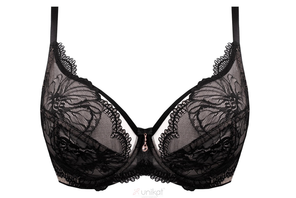 Měkké košíčky jsou vyrobeny z kombinace jemné síťoviny a elegantní krajky, díky čemuž se podprsenka dobře přizpůsobí tvaru prsou. Spodní část košíčku zajišťuje oporu a stabilitu, zatímco horní elastická část se přizpůsobuje přirozené linii poprsí. Podprsenka tak prsa sbírá ke středu, lehce je zvedá a vytváří přirozený, zaoblený tvar bez efektu vyztužení.