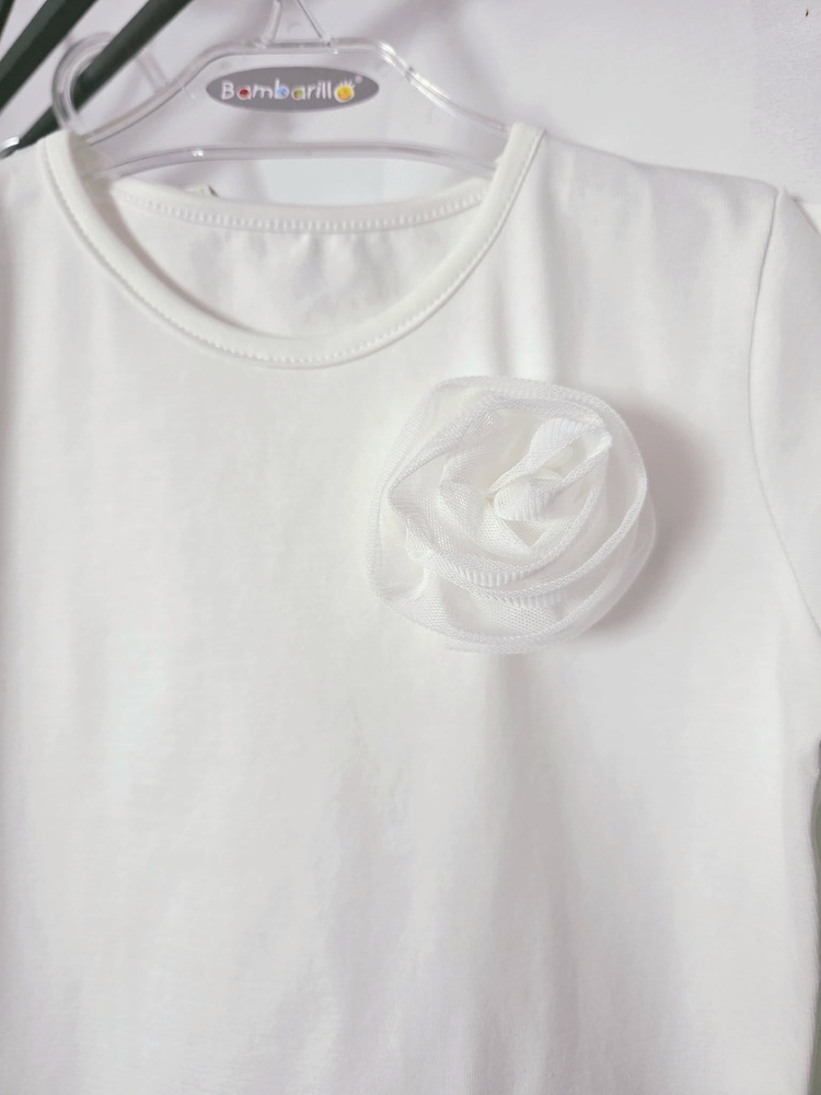 Halenka je vyrobena z kvalitního jersey materiálu, který je měkký, pružný a příjemný na dotek. Dobře se přizpůsobuje pohybu dítěte a neomezuje při běžných aktivitách. Výrazným prvkem je ručně šitá tylová růže, která dodává modelu jemný, dívčí charakter a odlišuje ho od klasických základních halenek.