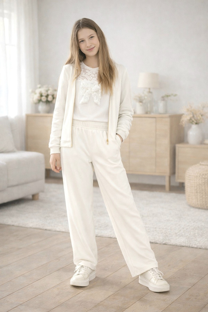 Halenka je vyrobena z příjemného materiálu, který se dobře přizpůsobuje postavě a neomezuje pohyb. Jemné krajkové vsadky dodávají modelu elegantní vzhled, zatímco dekorativní mašle podtrhuje dívčí styl bez zbytečné výraznosti. Konstrukce halenky je navržena tak, aby poskytovala komfort i při delším nošení.