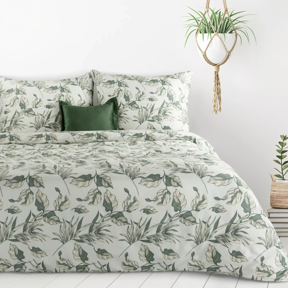 Tkanina je vyrobena z jemných vláken, která jsou příjemná na dotek a vhodná i pro citlivou pokožku. Subtilní květinový potisk dodává prostoru svěží a romantický charakter, zatímco druhá – jednobarevná strana umožňuje snadno změnit styl postele podle nálady nebo zařízení ložnice. Díky tomu získáte dva vzhledy v jednom produktu.